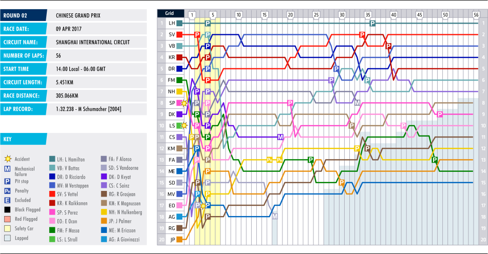 De Grand Prix van China begon met een vochtige baan en de meeste coureurs startten op intermediates. Alleen Carlos Sainz nam een gok en liet slicks monteren. De baan droogde echter snel op, wat voor veel vroege pitstops zorgde. Bandenleverancier Pirelli fabriceerde dit mooie overzicht van de diverse strategieën in China. Druk op de afbeelding voor een grotere weergave.