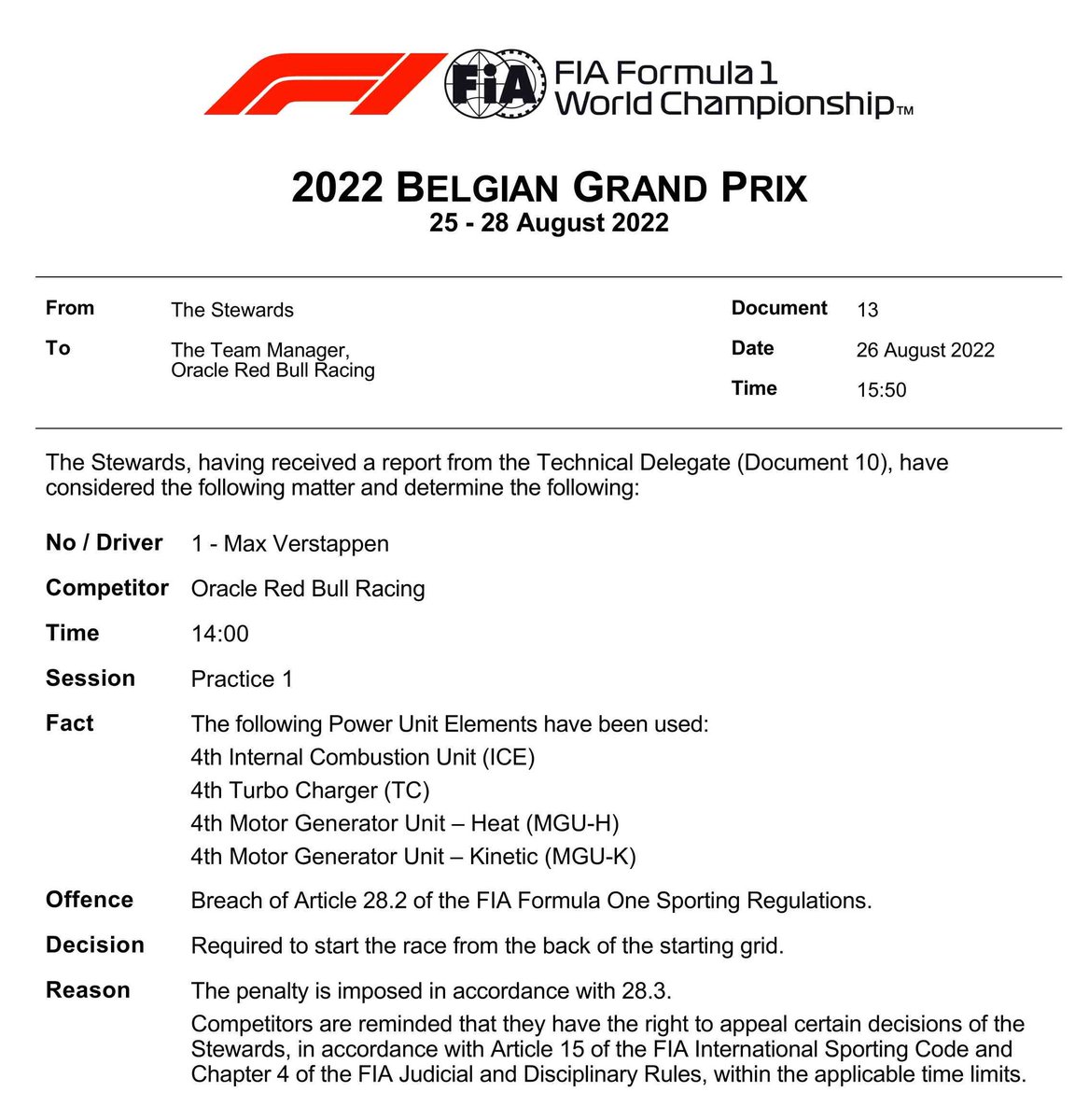 Zou de eerste motor wel een straf hebben betekend, dan zou de straf voor de tweede motor zijn doorgeschoven naar de race erna. Nu dus niet.