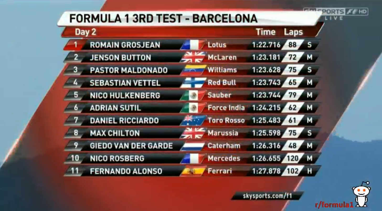 Button eindigde als tweede met Maldonado op de derde plaats. Caterham kende problemen en reed het minst aantal ronden van alle teams, slechts 48. Tijdens de dag waren er ook enkele rode vlaggen door gestopte wagens van Ricciardo en Grosjean in de ochtend, en het laatste kwartier door Giedo van der Garde en Maldonado.